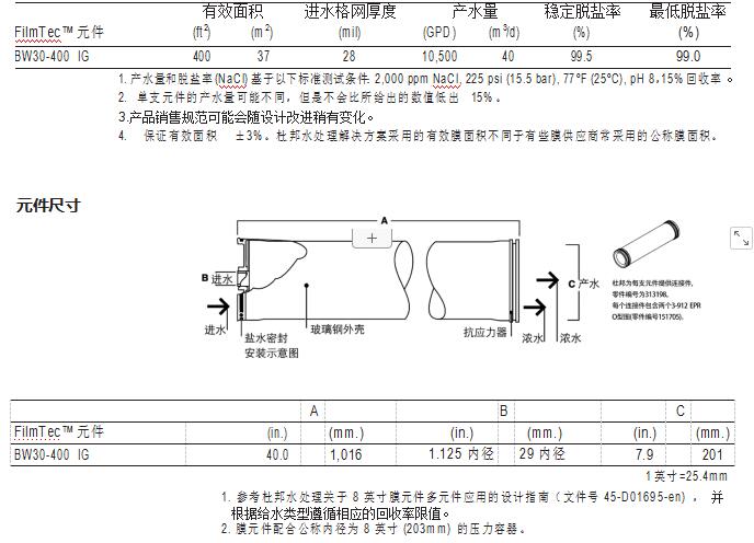 FilmTec™ BW30-400 在要求高品質(zhì)的產(chǎn)水時是很好的產(chǎn)品選擇。這是市場上第一 款 400 平方英尺的膜元件,繼續(xù)被廣泛用于新設(shè)備和舊系統(tǒng)改造,尤其系統(tǒng)資 金和生產(chǎn)力是考慮因素時。BW30-400 IG 保持了與 BW30-400 膜元件相同的流量 和脫鹽性能,只不過它不具備 ANSI 標(biāo)準(zhǔn) 61 認(rèn)證或是 KIWA 認(rèn)證,從而為工業(yè)級 的應(yīng)用提供了更具成本效益的選擇。