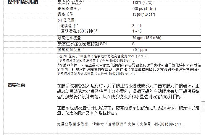 • FilmTec™ BW30-400 IG 膜元件在生產(chǎn)過程中無預(yù)氯化處理,保證了高產(chǎn)水量和 高脫鹽率。這是為什么 FilmTec™ 元件相比其他品牌元件更耐用且可以在最寬 的 pH 耐受范圍(1-13)進行化學(xué)清洗的原因。