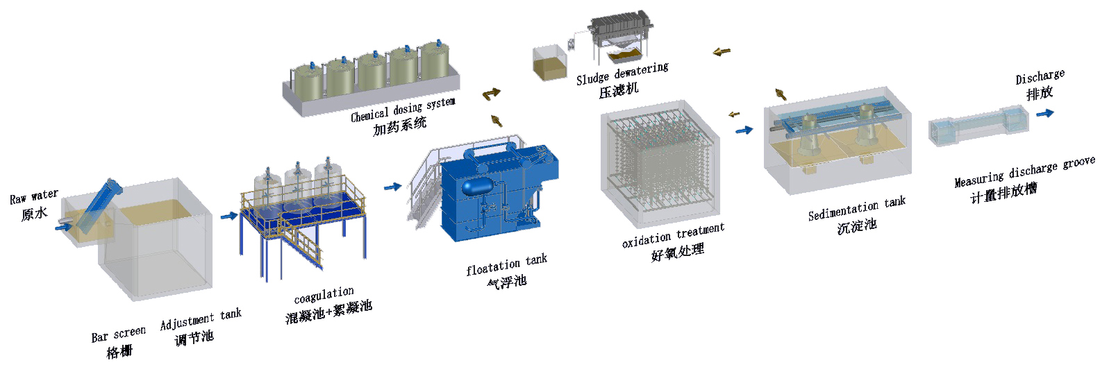 廢水從車間排放先經(jīng)過隔油池去除油脂性物質(zhì)后進(jìn)入調(diào)節(jié)池,調(diào)節(jié)水質(zhì)水量,然后由提升泵打入混凝氣浮池進(jìn)行分離,清水進(jìn)入生化系統(tǒng)進(jìn)行深度處理,廢渣進(jìn)入污泥脫水系統(tǒng)再委外處理,上清液進(jìn)入排放水池,然后經(jīng)計(jì)量排放槽計(jì)量排放。